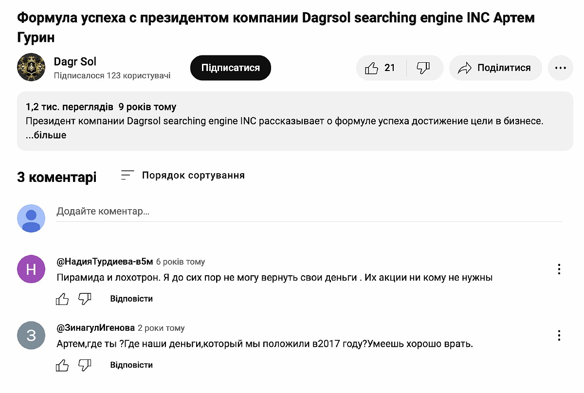 Сама Наталія у 2015 році брала інтерв’ю в автора американського проєкту Dagr Sol. Цей проєкт постійно змінював свій напрямок: то це була пошукова система, то це була криптоплатформа, але незмінним лишалося те, що компанія залучала гроші людей у вигляді акцій, які так і не повернула. Наразі компанію анульовано.