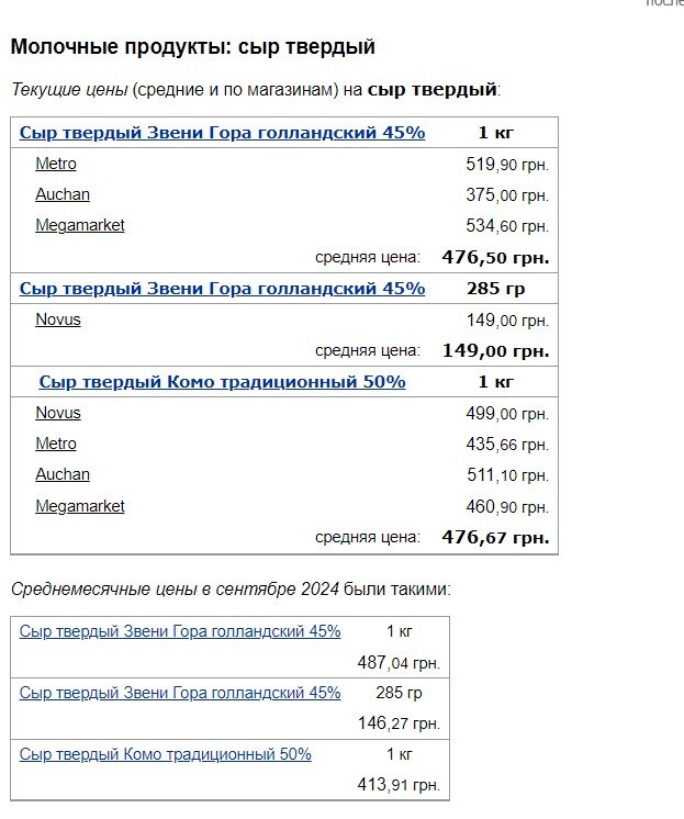 Традиційний сир "Комо" (50% жирності) також демонструє зростання – середня ціна становить 476,67 грн/кг порівняно з 413,91 грн у вересні. Різниця в цінах між магазинами сягає 75 гривень: від 435,66 грн у "Метро" до 511,10 грн в "Ашан".