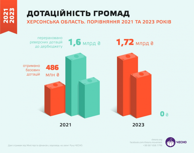 У 2023 році всі громади Херсонщини отримали базові дотації з центрального бюджету. Загальний обсяг базових дотацій громад збільшився в 3,5 разу порівняно з 2021 роком. Натомість реверсні дотації зменшилися до 0.