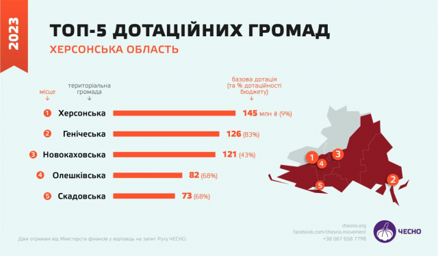 У 2023 році 71% громад Херсонщини мали критичний рівень фінансової спроможності, ще 16% – низький рівень. Херсонська область посіла четверте місце за обсягом отриманих з державного бюджету базових дотацій. Під окупацією росії перебувають 32 із 49 громад області та понад 70% території.