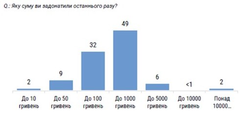 Цікаво, що однакова кількість (по 2%) тих, хто донатить менше 10 гривень і понад 10 тисяч гривень.