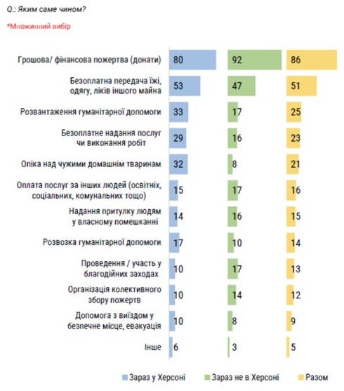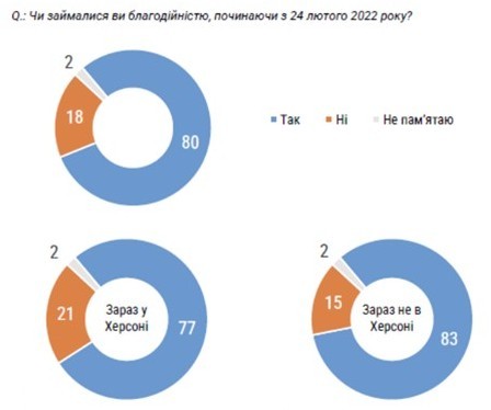 Під час опитування 4 із 5 херсонців (80% респондентів) заявили про свою участь у благодійних справах, починаючи з початку повномасштабного вторгнення. Серед них більшість (на 6%) зараз перебувають поза межами Херсонської громади.