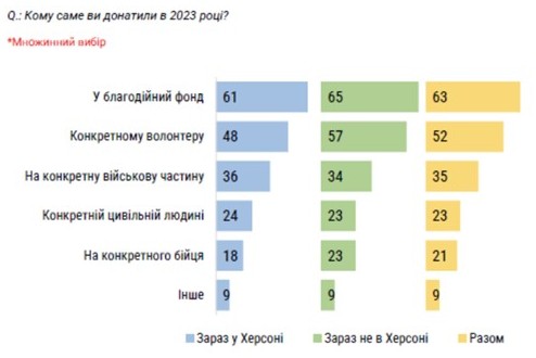 Більшість грошових пожертв жителі Херсонської громади спрямовують тим, хто їх потребує, через благодійні фонди (63%) та конкретних волонтерів (52%).Рідше донатять конкретним військовим частинам чи конкретним цивільним людям чи бійцям.