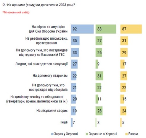 Найбільше коштів херсонці донатять на потреби Сил оборони України (87% з-поміж усіх опитаних, незалежно від місця перебування).Трохи менше жителі громади спрямовують свої кошти на такі види допомоги: