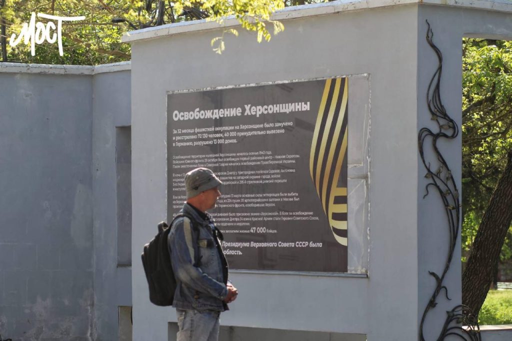 Наша кореспондентка побувала сьогодні там: зараз меморіал пустий. Прикрашають його лише кілька прапорів України, намальовані кимось із херсонців.