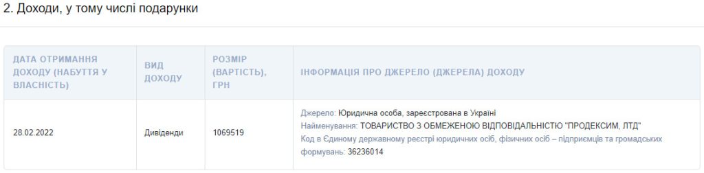 Вдень 8 березня 2022 року Ігор Колихаєв задекларував отримання 1069519 гривень від ТОВ “Продексим, ЛТД”. Отримав він їх 28 лютого.