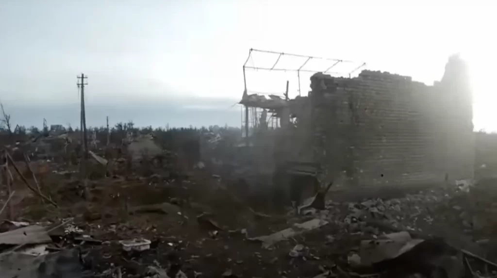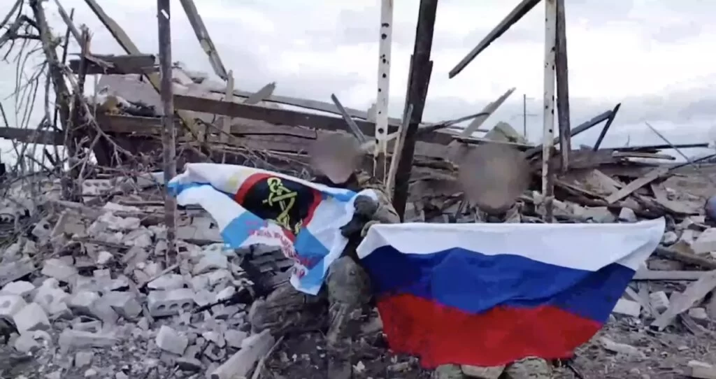 19 лютого 2024 року. Кринки, Херсонська область. Троє військових 810-ї окремої бригади морської піхоти Чорноморського флоту РФ рухаються перебіжками по руїнах знищеного українського села. Раптом вони зупиняються біля однієї з розвалин, дістають прапор бригади та російський триколор і записують відео про те, що “Крынки – наши”.