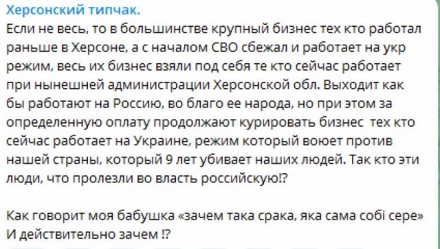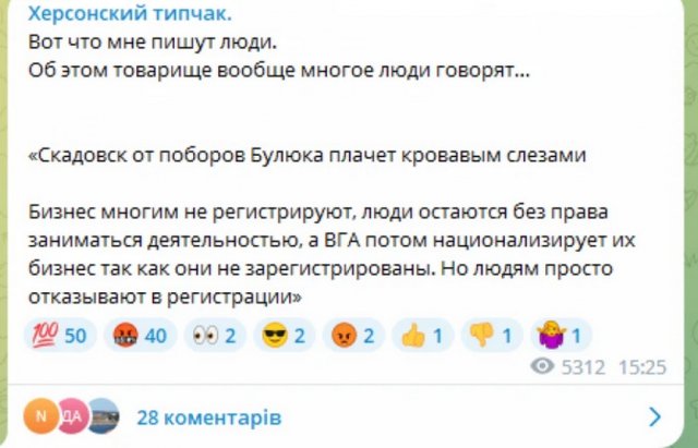 В окупаційних пабліках з’являються дописи щодо корупції з боку так званого першого заступника окупаційного уряду Херсонської області, державного зрадника і колаборанта Віталія Булюка.