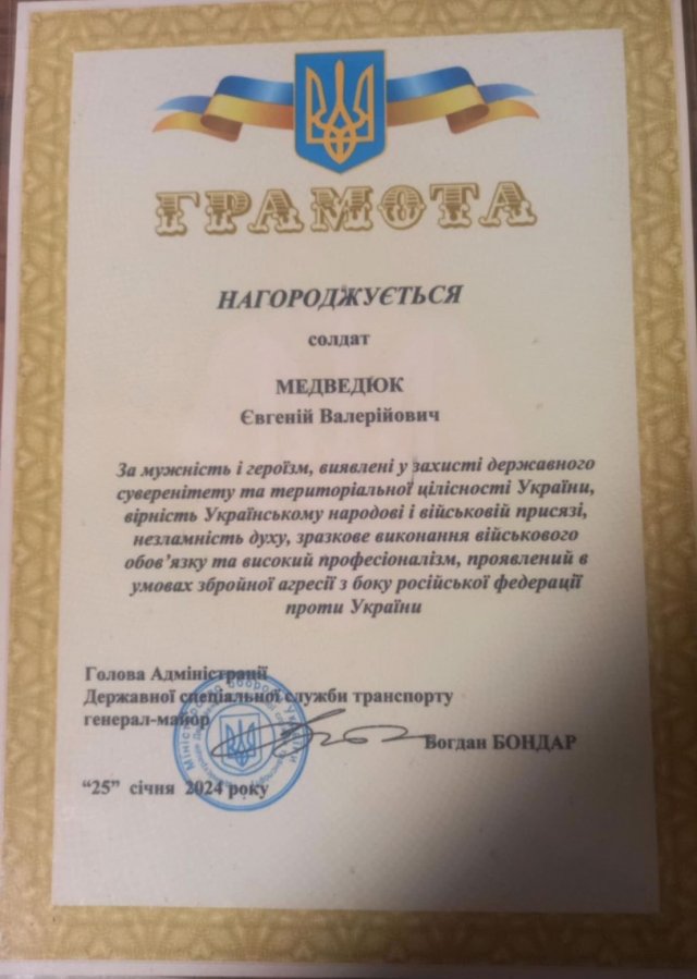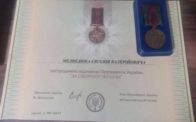 Відповідний наказ видав Головнокомандувач Збройних сил України. Ця нагорода надається військовим за особисту мужність і самовіддані дії, виявлені у захисті державного суверенітету та територіальної цілісності України, вірність військовій присязі.За час проходження військової служби Євгеній Медведюк не одноразово був відзначений грамотами військового керівництва Збройних Сил України, та Указом Президента України був нагороджений відзнакою Президента України «ЗА ОБОРОНУ УКРАЇНИ»
