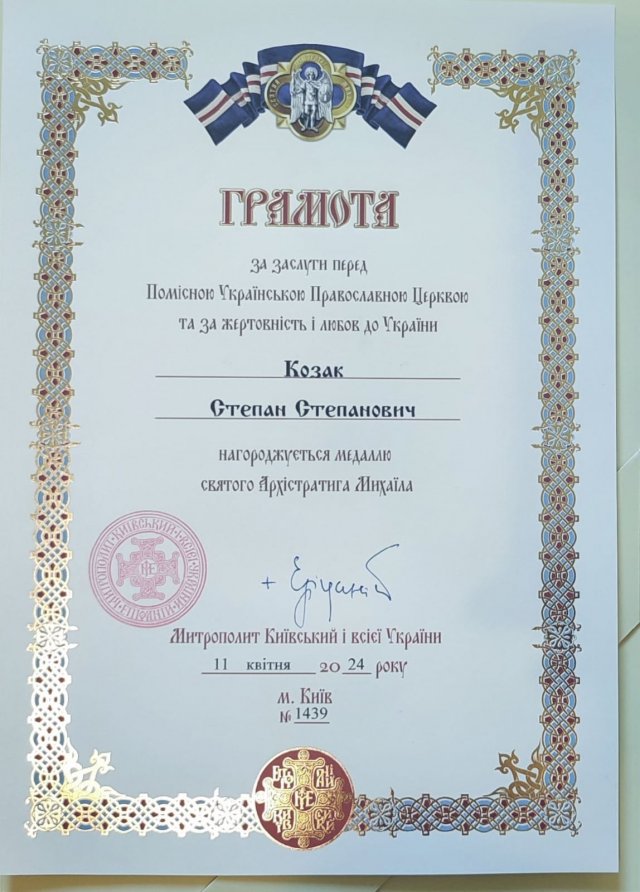"У Світлий понеділок, 6 травня, у Троїцькому храмі міста Кривий Ріг Степану Козаку вручили медаль святого Архістратига Михаїла, якої його удостоїв Предстоятель Православної Церкви України Блаженніший Митрополит Київський і всієї України Епіфаній.