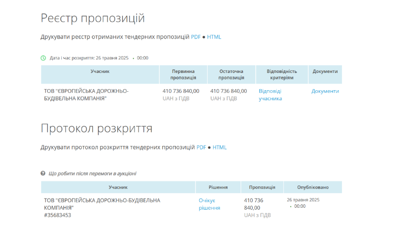 Бюджет проєкту перевищував 432 мільйони гривень, а прийом заявок на участь у тендері тривав до 26 травня. Проте участь у торгах взяла лише одна компанія.