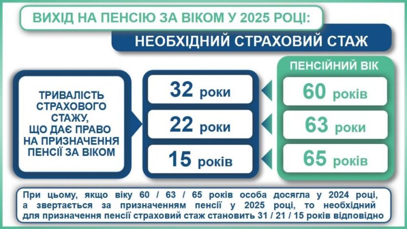 Вже у 2025 році, щоб піти на пенсію у 60, потрібно мати 32 роки стажу, тоді як для виходу у 63 достатньо 22 років, а у 65 — лише 15. До 2028-го ситуація кардинально зміниться: вимога для 60 років сягне 35 років, а для 63 — 25.