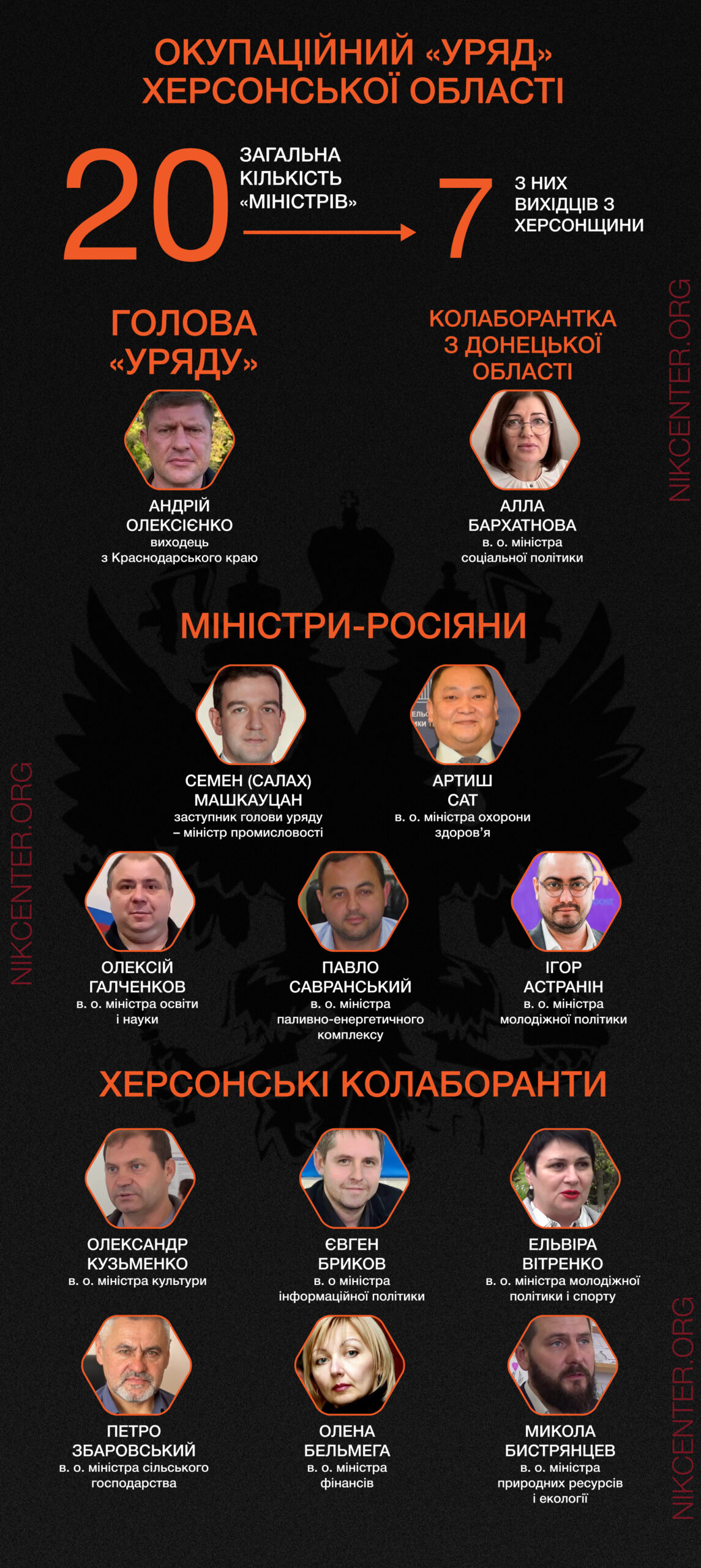 Хабарництво, звʼязки із бойовиками «ЛДНР» і спроби рейдерства – це шлейф, що тягнеться за людьми, призначеними росіянами у так званий «уряд» Херсонської області. Серед них як зрадники України з Херсонщини, так і росіяни, які проміняли карʼєру у власній країні на посади в неіснуючих міністерствах на захопленій території. Nikcenter розкриває їхні імена та біографії, адже більшість цих «урядовців» досі залишалися непублічними.