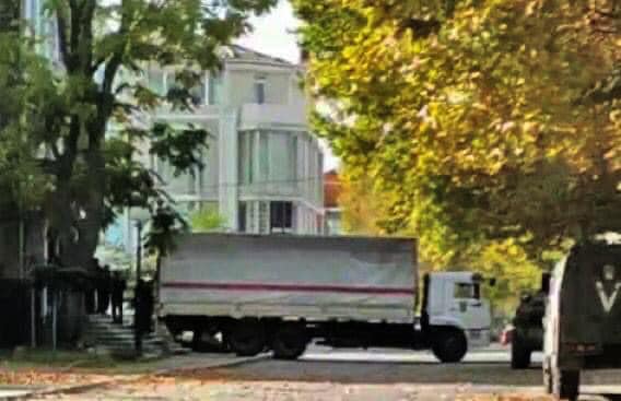 Вантажівки окупантів біля Херсонського архіву, фото: Архів національної пам’яті