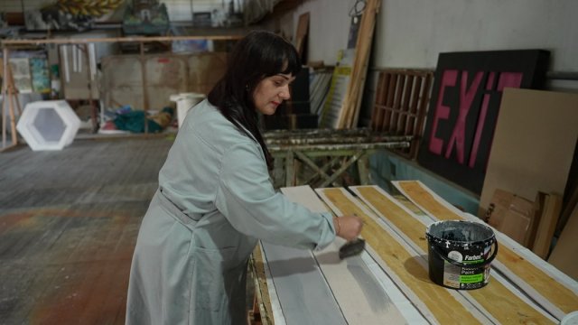 Олена Каравай з Херсона через повномасштабне російське вторгнення переїхала на Хмельниччину в лютому 2022 року. Наразі вона виготовляє декорації у Хмельницькому обласному академічному муздрамтеатрі імені Михайла Старицького.