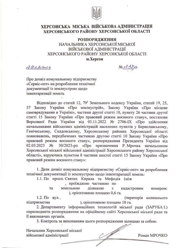 Мрочко дозволив Сервіс-опту провести інвентаризацію землі