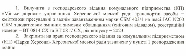 Сміттєвози передали від “Міського дорожного управління” до “Парків Херсона”.