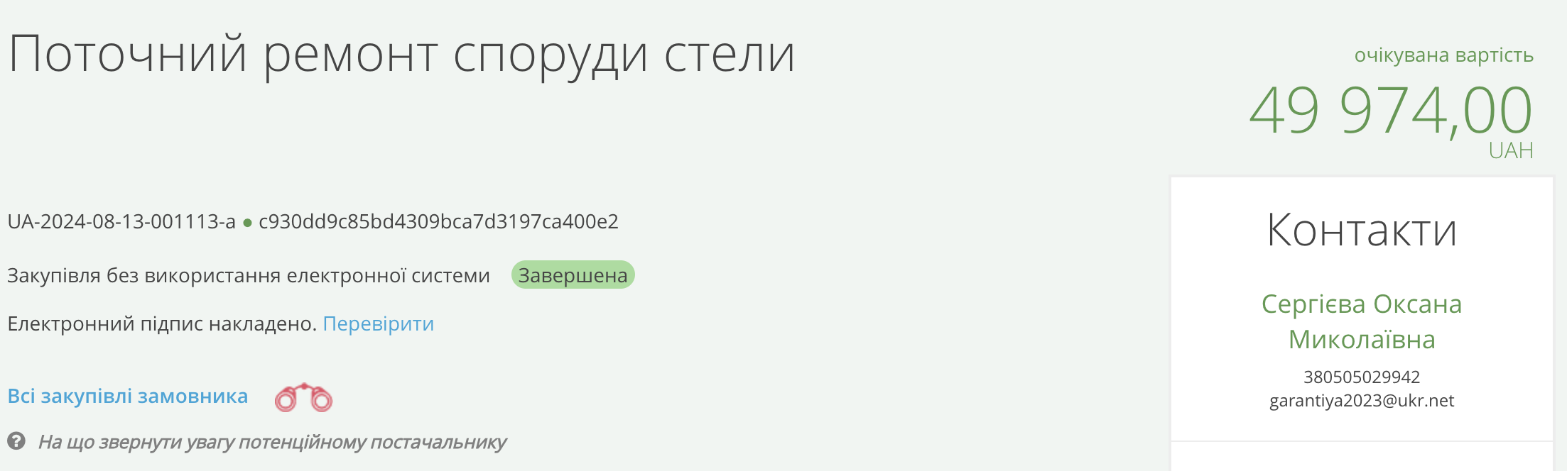 І вже 13 серпня на порталі державних закупівель “Prozorro” з’явився новий тендер на 49 974 гривні. У новому договорі вже не було 19 літер, мурування стін, армування кладки та інших робіт, які коштували 148 тисяч гривень.
