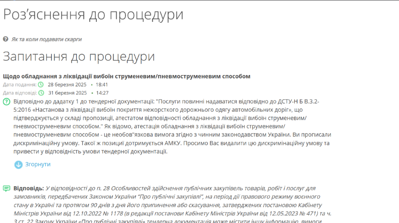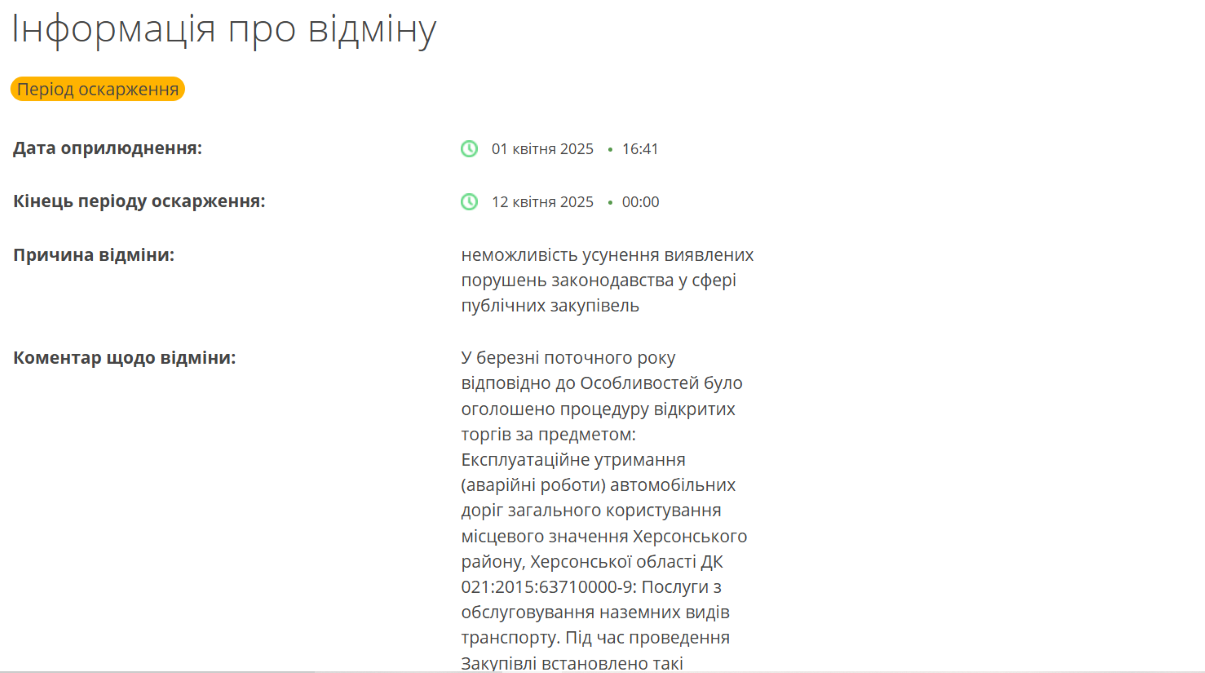 Скриншот: ProzorroКрім того, учасники просили пом’якшити формулювання вимог до підтвердження досвіду, а також уточнити нюанси щодо врахування інфляційних витрат та ризиків у договірній ціні. Оскільки усунути виявлені порушення в межах поточної процедури неможливо, закупівлю було скасовано. Нові скарги за цією процедурою ще можуть подаватися до 12 квітня.