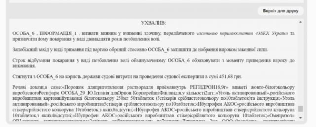 Великоолександрівський районний суд Херсонської області у вироку від 29 квітня 2024 року визнав росіянина винним за ч. 1 статті 438 КК України та заочно засудив до 12 років позбавлення волі.