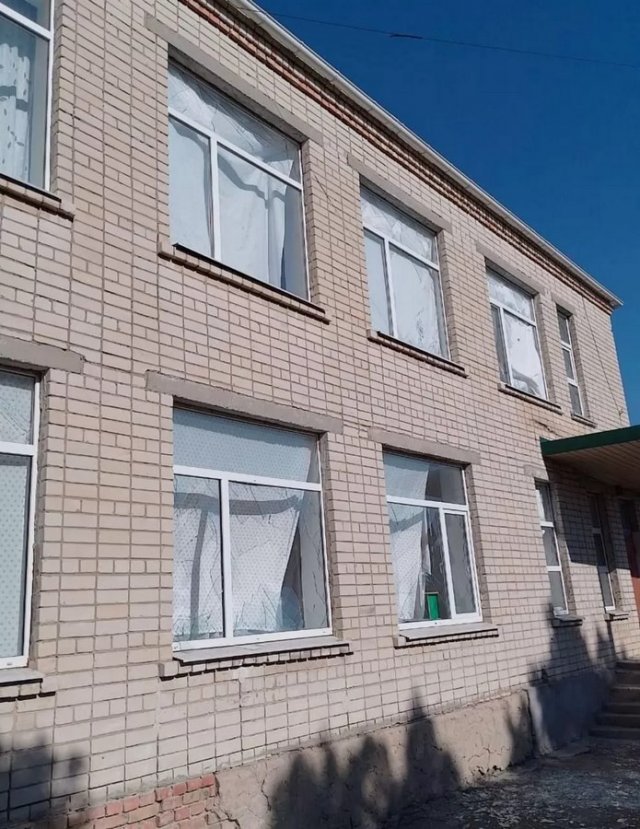 У будівлі пошкоджено дах та вибито з десяток вікон. Опубліковані фотографії пошкоджень. На них видно пошкоджену двоповерхову будівлю.