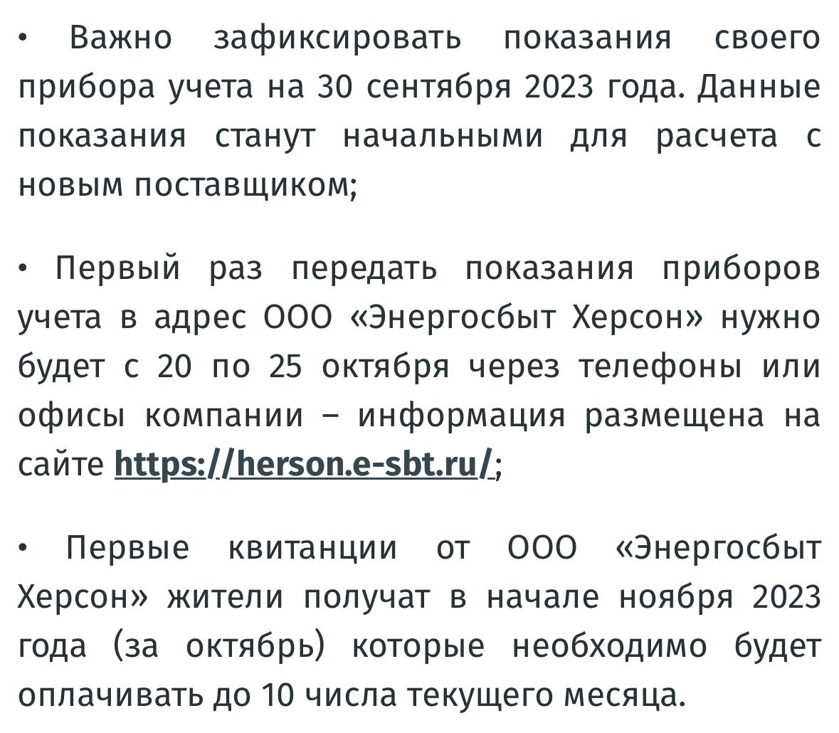 Жителів окупованої частини Херсонщини вже попередили, що вони мають зафіксувати показники електролічильників на 30 вересня. Ці показники стануть "стартовими" для сплати за спожиту електроенергію. Передавати показники в "Энергосбыт Херсон" вимагають наприкінці жовтня, а перші "платіжки" жителі окупованих територій отримають вже у листопаді.