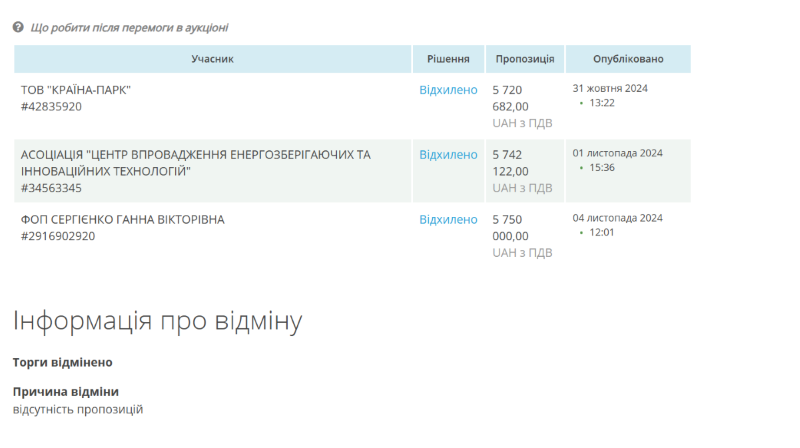 Це не перше оголошення щодо придбання сонячних станцій. Тендер намагалися провести у жовтні. Свої пропозиції на конкурс подали троє учасників: ТОВ "Країна-парк", асоціація "Центр впровадження енергозберігаючих та інноваційних технологій", ФОП Сергієнко Ганна Вікторівна. Але всі пропозиції було відхилено. При тому, що причиною анулювання торгів зазначили відсутність пропозицій.