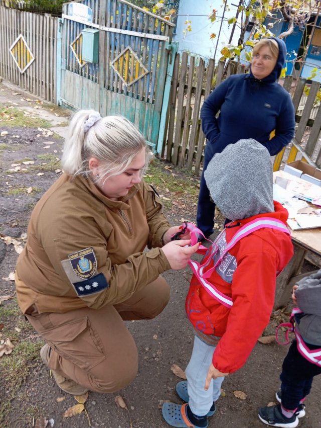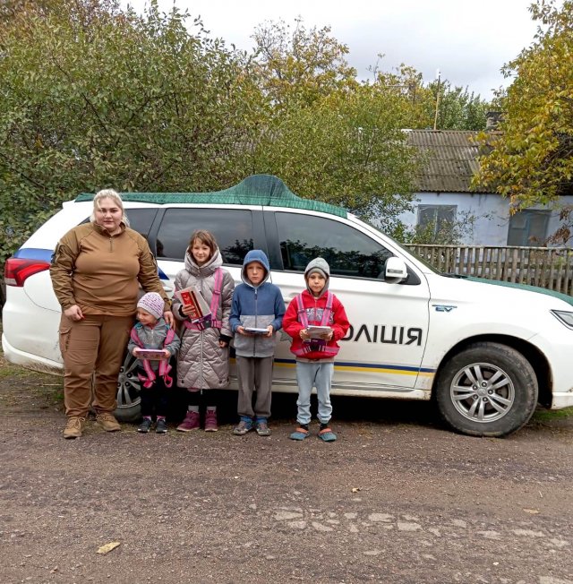 Наприкінці зустрічі поліцейські подарували малечі канцелярське приладдя, світловідбивні браслети та жилети.