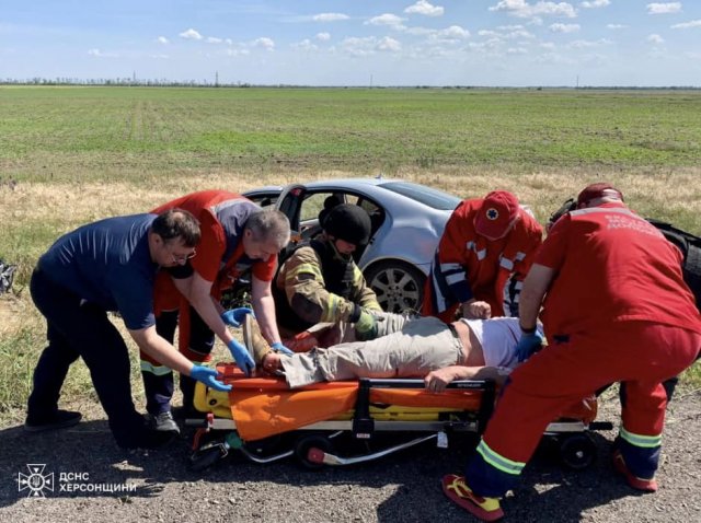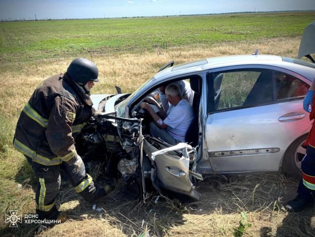 Херсонські рятувальники надали допомогу водію, що постраждав при ДТП. Водія одного з автомобілів затиснуло понівеченими конструкціями автівки.