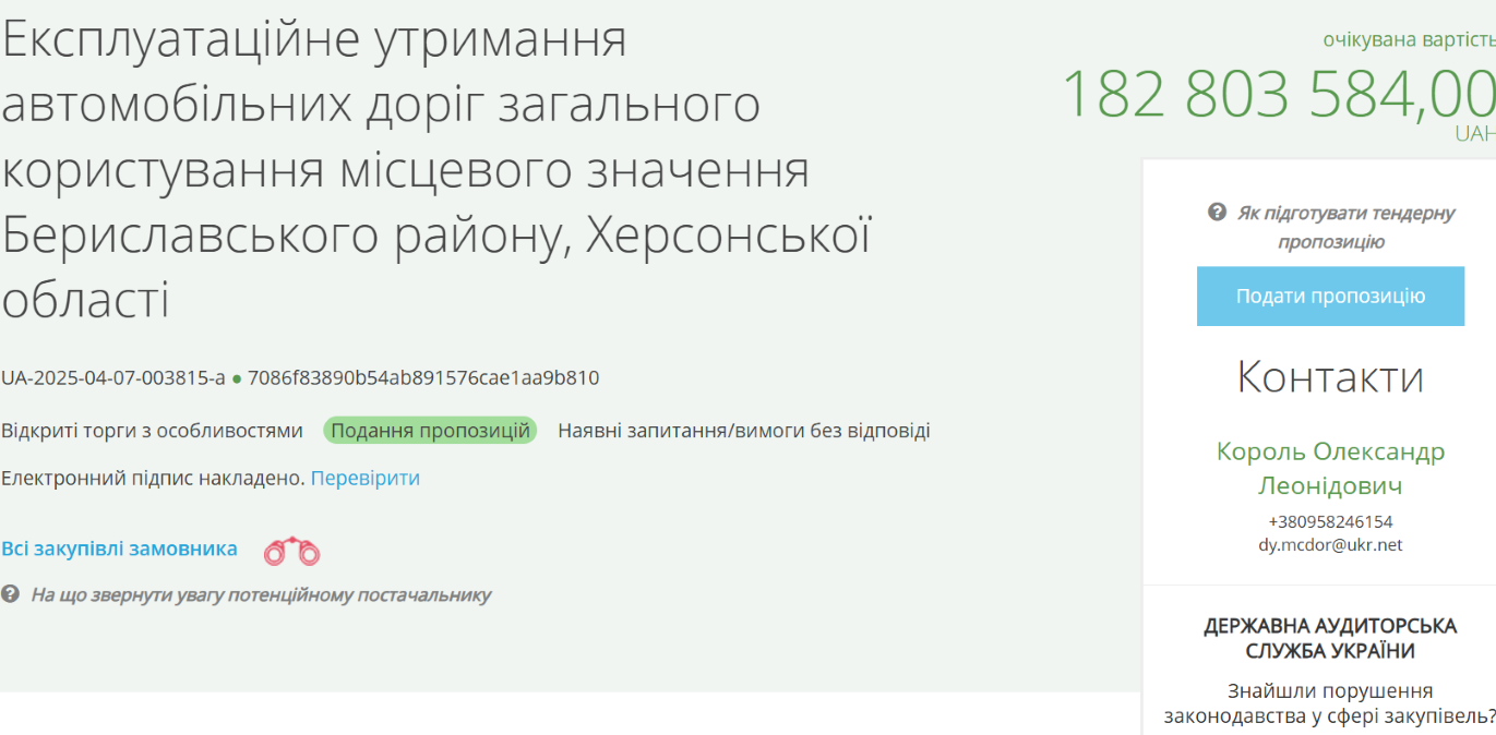 Державна установа "Місцеві дороги Херсонщини" оголосила відкриті торги на надання послуг з експлуатаційного утримання автомобільних доріг в Бериславському районі області.