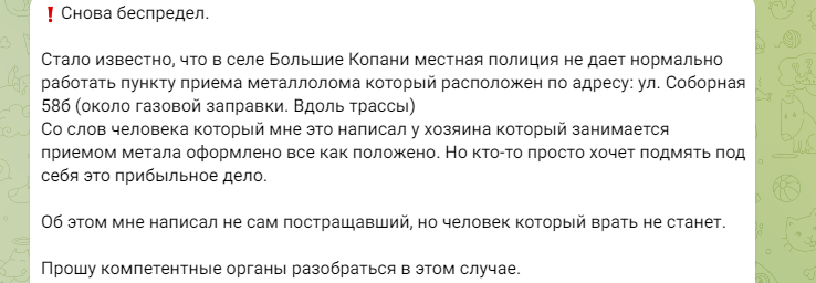 В так званого підприємця наявні всі оформлені документи на діяльність "згідно законодавства" рф, але, попри це, на нього чинять тиск поліцаї. Його пункт прийому щоразу закривають, не називаючи підстав. Кого саме з місцевих гауляйтерів зацікавив прибутковий бізнес, не повідомляється.
