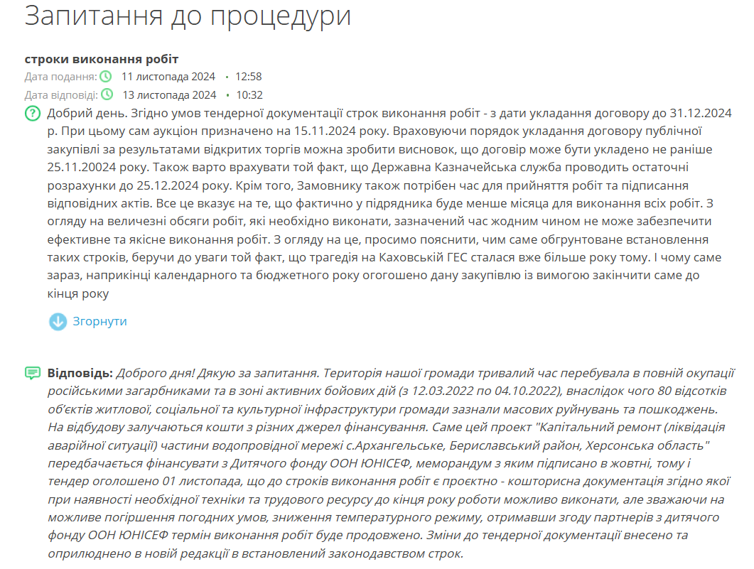 "З огляду на це, просимо пояснити, чим саме обгрунтоване встановлення таких строків, беручи до уваги той факт, що трагедія на Каховській ГЕС сталася понад ріку тому. І чому саме зараз, наприкінці календарного та бюджетного року оголошено дану закупівлю із вимогою закінчити саме до кінця року", - запитав учасник.Замовник пояснив це тим, що на відбудову залучені кошти Дитячого фонду ООН ЮНІСЕФ, меморандум з яким підписано в жовтні, тому і тендер оголошено 01 листопада.