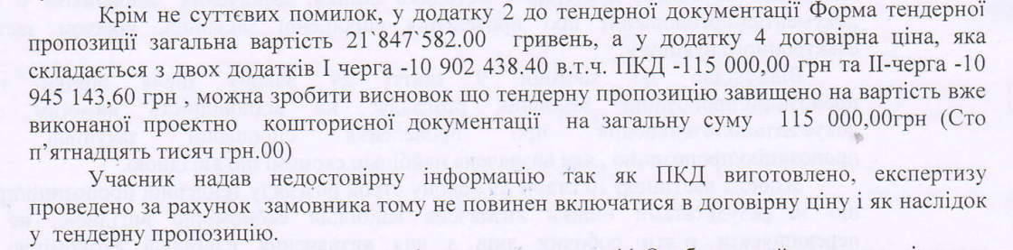 На конкурс подався один учасник - ТОВ "Берег транс буд". Тож саме з ним селищна рада могла укласти угоду про ремонт водопроводу. Однак, виявилось, що фірма завищила кошторис на понад сто тисяч гривень.
