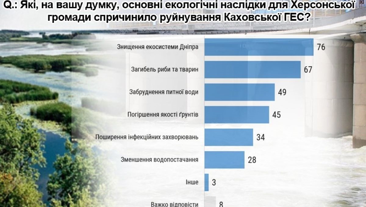 Згідно з дослідженням, 25% херсонців усе ще турбує ситуація, що склалася після руйнування дамби. Серед людей, які виїхали з громади, цей показник ще вищий. Найбільш болючими наслідками опитані назвали знищення екосистеми Нижнього Дніпра (76%), руйнування дач (50%) і психологічний стрес (44%).