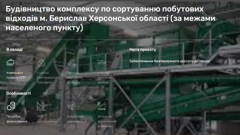 У місті Берислав на Херсонщині планують збудувати новий комплекс для сортування побутових відходів. Об'єкт розташують за межами населеного пункту. Проєкт уже включено до Єдиного проєктного портфеля (ЄПП) та є частиною секторального портфеля регіону, однак наразі він перебуває на етапі пошуку джерел фінансування.