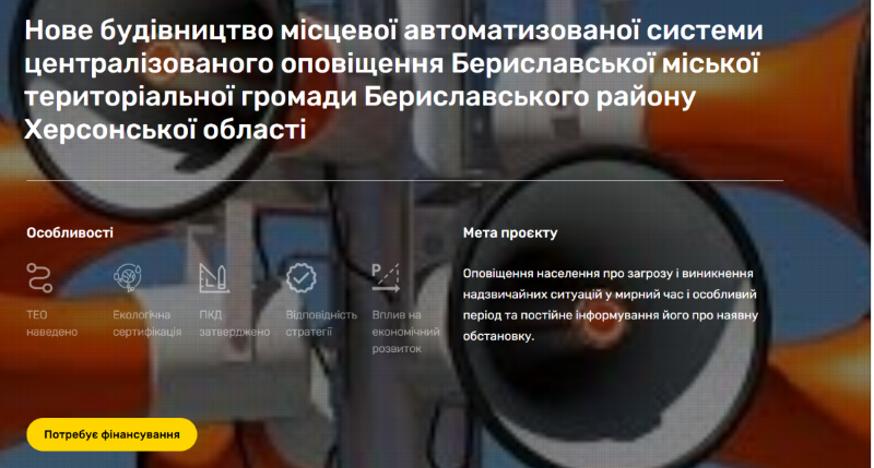 Планується нове будівництво місцевої автоматизованої системи централізованого оповіщення Бериславської міської територіальної громади Бериславського району Херсонської області. Ініціатором проєкту виступив виконавчий комітет Бериславської міської ради.