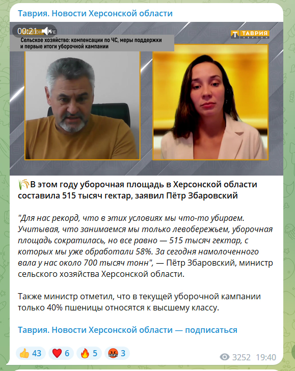 За словами Петра Збаровського, якість лише 40% зібраного зерна відповідає нормам для продовольчої пшениці. Окупанти і раніше скаржилися на якість пшениці в Херсонській області, яка виявилася значно гіршою за очікувану.