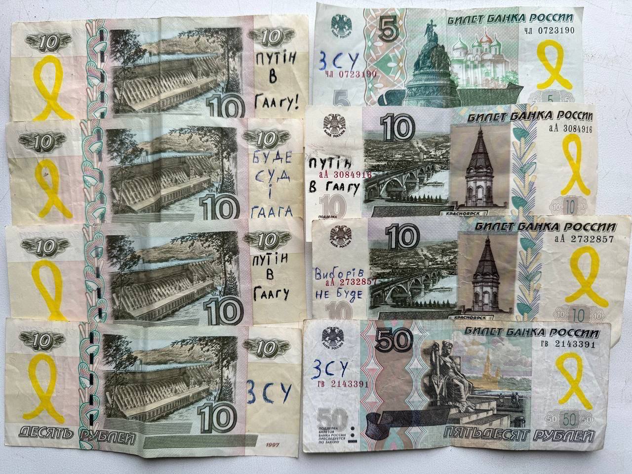 На окупованій Херсонщині активісти залишають проукраїнські надписи на російських рублях