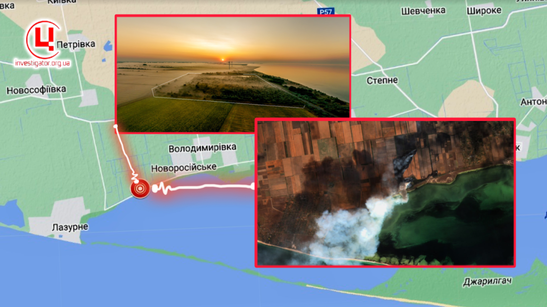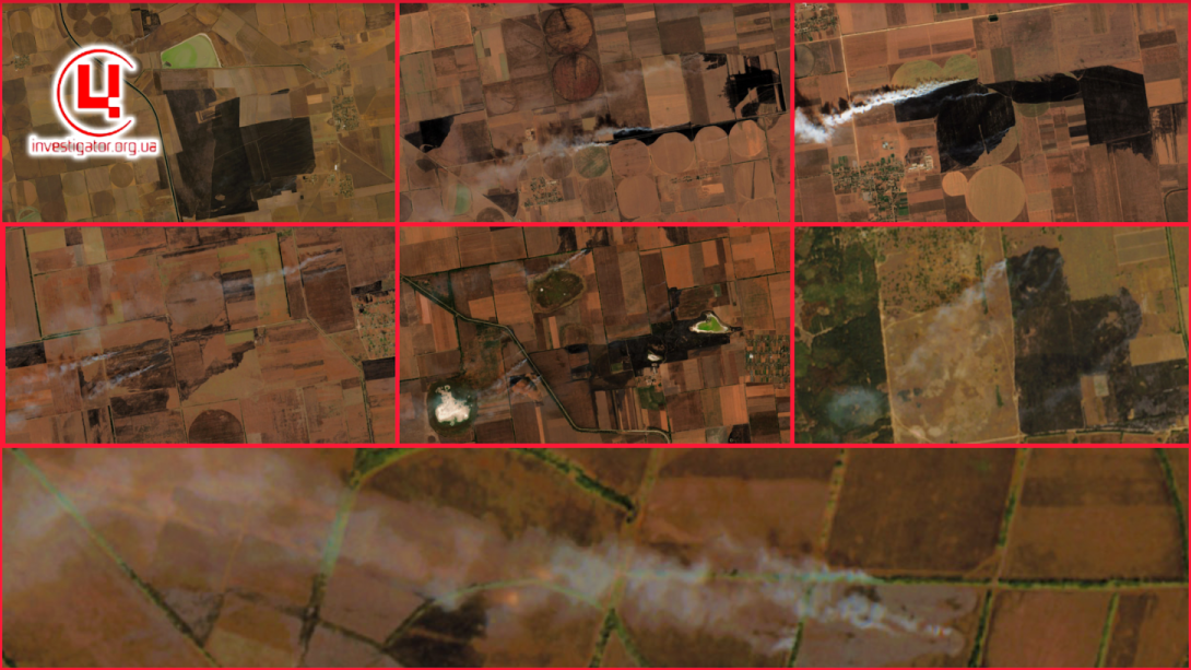Горіння лісопосадки біля с. Новоросійське Скадовського р-ну, 01.10.2023 р., Фото: супутник «Sentinel-2», колаж: investigator.org.ua