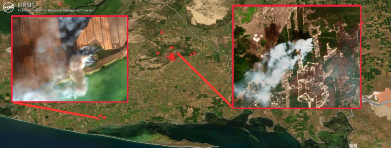 IRMS NASA внесла до всесвітньої карти масштабних пожеж займання поблизу с.Виноградове і с Лазурне, 01.10.2023р, колаж: investigator.org.ua