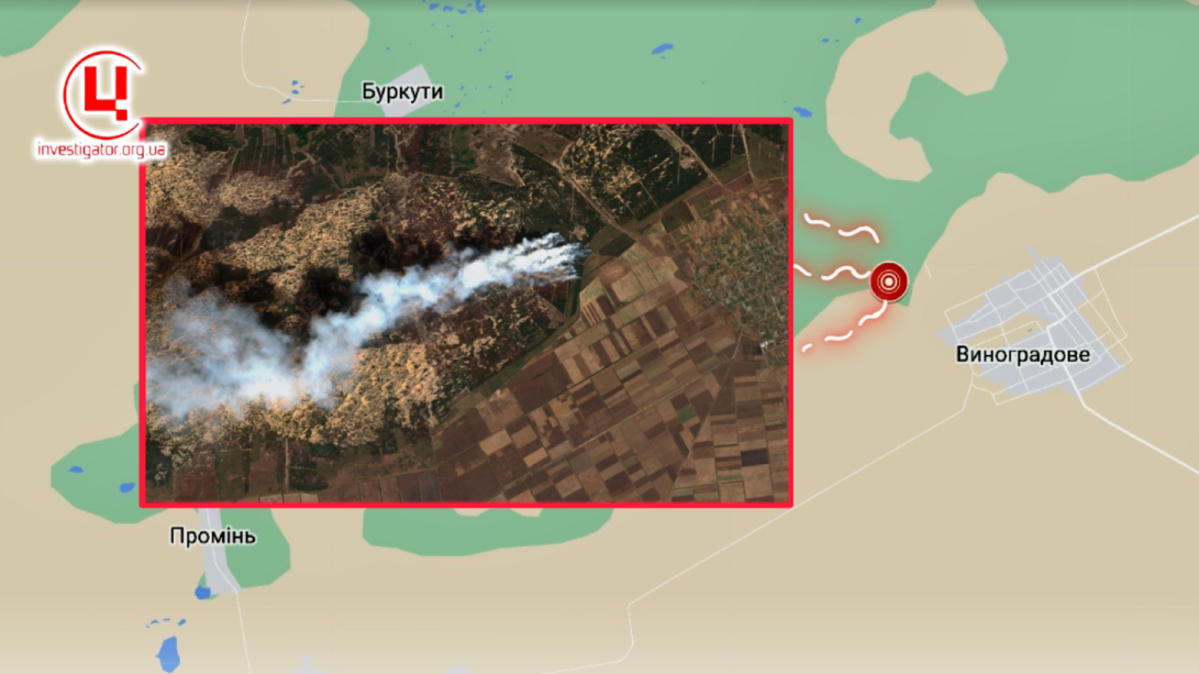 Епіцентр пожежі космічна місія дистанційного зондування Землі як раз зафіксувала двома днями раніше у 4 км на захід від с. Виноградове.