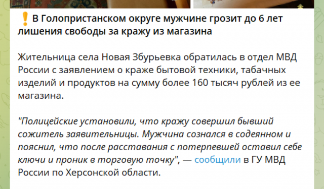 Загальна сума крадіжки виявилась близько 160 тисяч рублів (це близько 67,2 тисяч гривень за курсом НБУ 0,42 гривні до рубля). Крадієм виявився колишній співмешканець господарки крамниці. Після розставання він зберіг ключі від крамниці і зрештою пограбував.