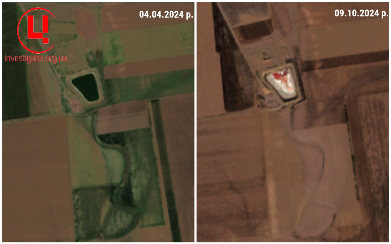 Ставок с.Іванівка на знімках супутника Sentinel-2 у квітні та жовтні 2024 р. Фото: apps.sentinel-hub.com Колаж: investigator.org.uaНетипова осіння посуха 2024 року, звісно, не оминула окуповану Херсонську область. Серед іншого висохли озера Чорнянки, найбільше з яких мало площу понад 2 квадратних кілометри, майже зникли схожі водойми в селищі Бехтери, обміліли ставки в Нижніх Сірогозах, Новоолександрівці та знамените Рожеве, або Лемурійське озеро.