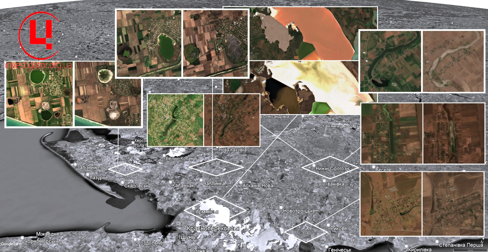 Знімок супутника території колишнього Каховського водосховища на р.Дніпро. 22.10.2024 р. Фото: apps.sentinel-hub.comОкупована Херсонщина від теракту на Каховській ГЕС постраждала найбільше і досі оговтується від наслідків влаштованого Росією екоциду. По всьому регіону є гострий дефіцит питної води, не кажучи вже про сільськогосподарські потреби. В березні 2024-го гауляйтер Сальдо озвучив чергові фантазії про часткове переобладнання русла Північно-Кримського каналу, розбивши його на озера або ставки, в яких зберігатиметься вода з артезіанських свердловин. У червні він вже анонсував, що за 60 млрд. рублів з Каланчацького лиману за два наступні роки зроблять одне з основних джерел прісного водопостачання на південному заході Херсонської області. Водночас, навіть російські так звані експерти визнають, що запаси підземних вод и близько не зможуть замінити Каховське водосховище.