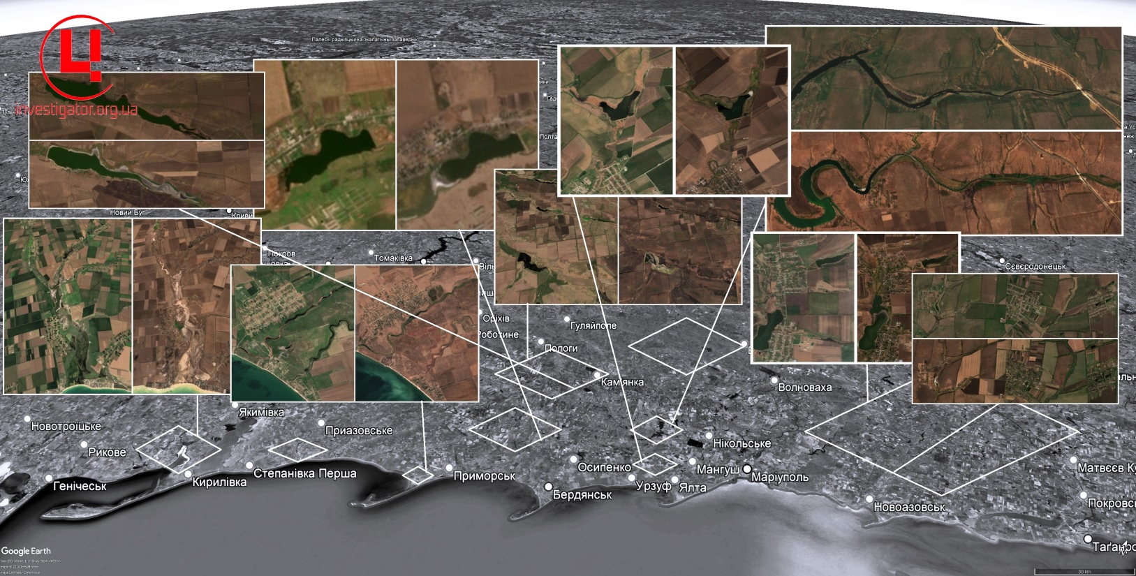 Порівняння супутникових знімків найбільших водойм окупованого півдня Запорізької та Донецької областей за травень і жовтень 2024 р. Фото: Google Earth, apps.sentinel-hub.com Колаж: investigator.org.uaЗа 50 кілометрів на схід від водойми на річці Берда аналогічна проблема простежується на Старокримському водосховищі на річці Кальчик, з якого живиться Маріуполь. Рівень води падає і, майже, в усіх ставках в радіусі 100 кілометрів довкола окупованого міста Марії.