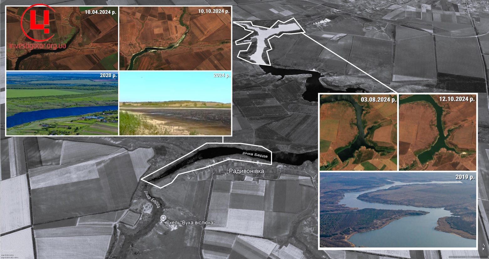 Русло р.Берда та водосховище на супутникових, архівних і свіжих знімках. Фото: соцмережі. Колаж: investigator.org.uaІ це не єдина проблемна ділянка, обміління також спостерігається вище за течією, в районі Стародубівки. Наразі загарбники змушені вдаватися до екстрених заходів – запроваджувати погодинні відключення води, знижувати тиск в міських мережах.