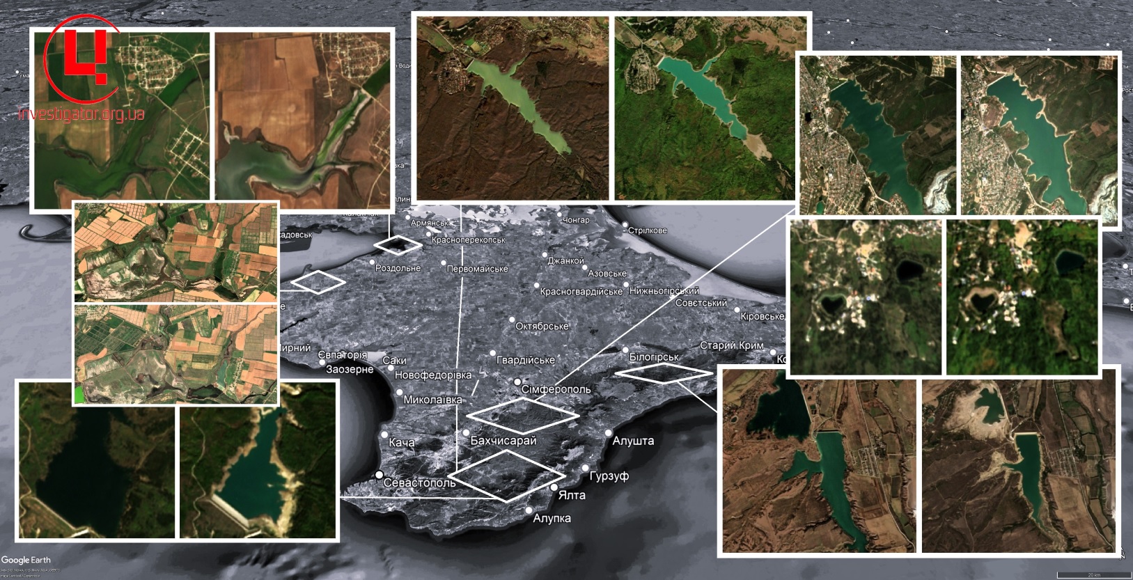 На супутникових знімках помітно, що вдвічі зменшилось Керченське водосховище, Фронтове, почали міліти Загорське і Аянське, пересихають річки на півночі півострова.