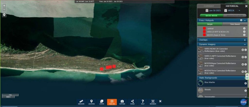 Судячи з публічної мапи, займання зафіксовано в східній частині острова, ближче до маяку.