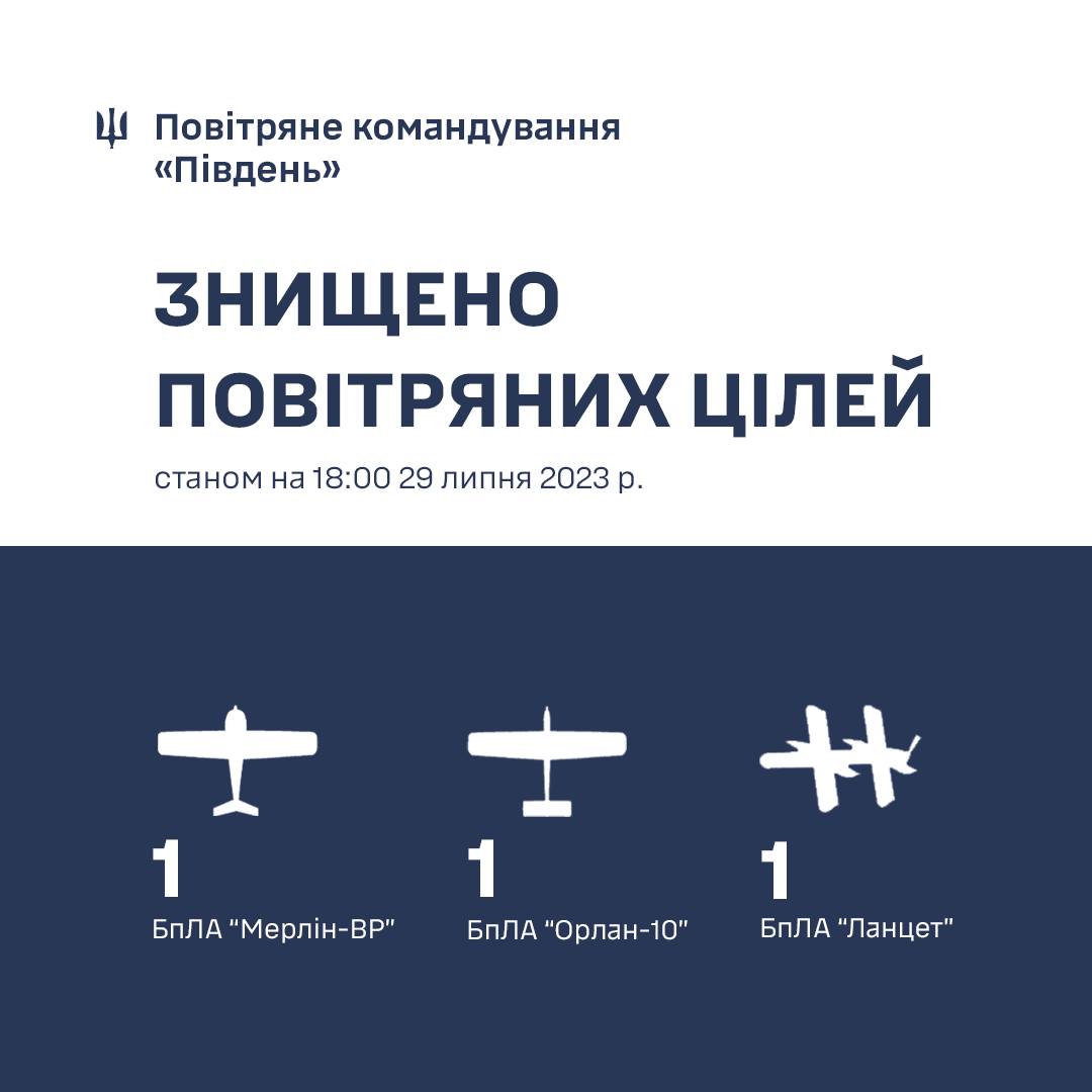 Зокрема, у Миколаївській області знищений розвідувальний "Мерлін-ВР", у Херсонській області – розвідувальний "Орлан-10" й ударний "Ланцет".
