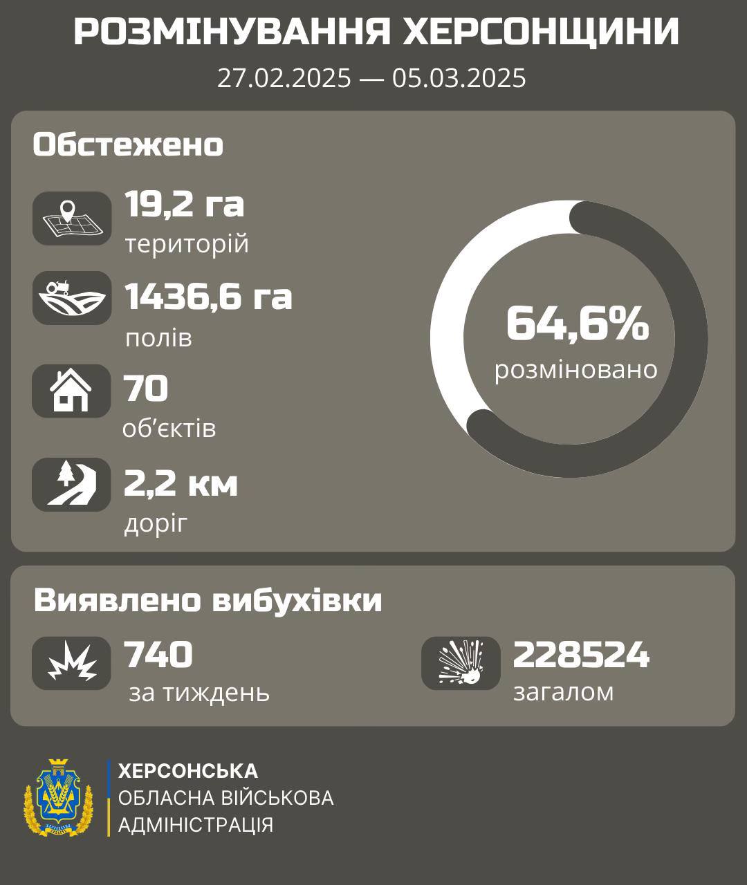 За даними ОВА, розміновано 64,6% території. За тиждень сапери виявили 740 ВНП, обстежили 2,2 км доріг, 70 об’єктів.